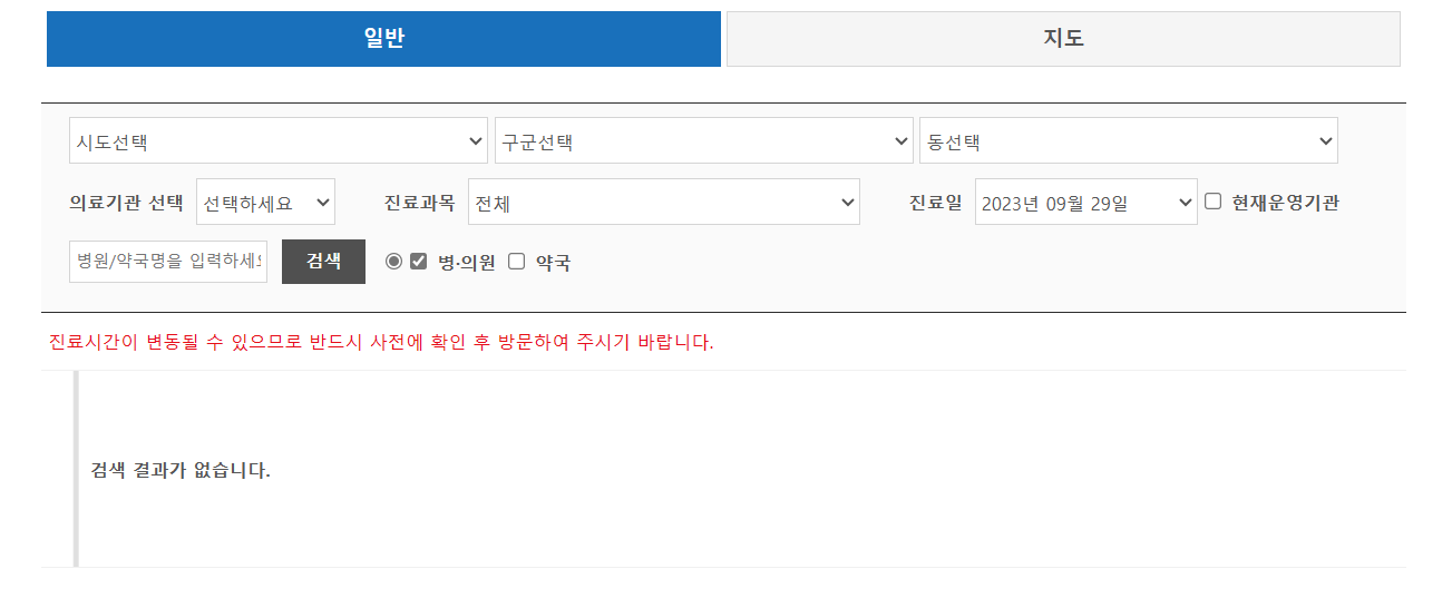진료일 체크하고 검색을 누르면, 추석 연휴기간에 운영하는 병원을 알 수 있습니다.